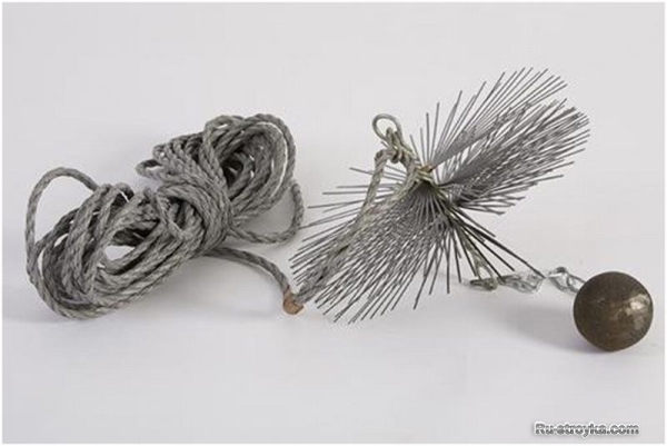 Необходимые действия для очистки дымохода: 1. Необходимо приготовить мыльный раствор и нанести его с помощью кисти в топку печи или камины примерно на тридцать минут. Затем, этой же кистью счистить всю сажу. В конце все необходимо смыть чистой водой с помощью тряпки. 2. Для прочистки дымохода нам понадобиться изготовить приспособление для прочистки дымохода. Это приспособление состоит из металлической щетки, веревки и груза, который подвешивается на низ щетки. Металлические щетки нужны с большим ворсом. Их надо собрать в одну кучу ворсом наружу, чтобы концы щетки доставали до стенок дымохода. На низ щеток подвешивается груз весом примерно 200-300 грамм и щетки прикрепляются к веревке. 3. Сама чистка происходит опусканием до самого низа щеток на веревке и поднятием обратно, так должно продолжать примерно 15-20 минут.
