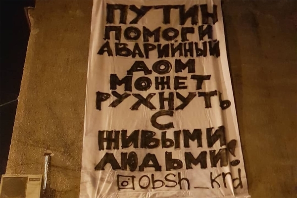 Жители аварийного общежития в Краснодаре обратились к президенту России Владимиру Путину за помощью. Они вывесили на стене здания огромный плакат «Путин, помоги. Аварийный дом может рухнуть с живыми людьми!» и выложили фото в Instagram.
