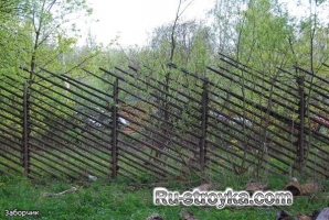 Для изготовления изгороди можно использовать старые рейки, связав их вверху и внизу толстой проволокой. Сплетенные таким образом секции ограды прибивают к столбам, вкопанным на расстоянии 2—3 м друг от друга.
