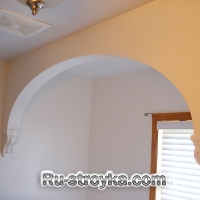 Арки из гипсокартона изготовить совсем несложно. Изначально необходимо определить, где мы будем устанавливать арки, в дверных проемах, или для красоты.Рассмотрим изготовление декоративной арки. Изначально, необходимо присверлить брус к потолку по всей ширине и длине арки. Также бруски необходимо присверлить по стенам, чтобы арка держалась жестко и не шаталась при прикосновении. На листе гипсокартона мы рисуем полукруг, такого формата, какая должна быть арка. Лобзиком мы выпиливаем этот полукруг. Таким образом, мы изготавливаем два таких куска (фото 1). После этого, закрепляем их в нужное место, а по полукругу вставляем нарезанные бруски и вставляем их в промежуток между двумя листами гипсокартона, закрепив их саморезами (фото 2). Отрезаем полосу из гипоскартона по ширине арки и начиная с края, закрепляем ее на установленные бобышки из бруса. Чтобы не промохнуться мимо бобышек, смотрим по бокам, где находятся саморезы (фото 3). Далее по краям устанавливаем пластиковый арочный уголок, закрепив его по кругу с двух сторон (фото 4). Далее шпатлюем торец арки (фото 5). После высыхания шпатлевки, шлифуем ее наждачной шкуркой (фото 6). Нанеся грунт на арку, приступаем к её покраске.