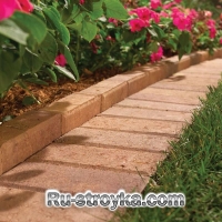 2. Границу газона с садом делаем из красного кирпича или бетонной брусчатки. Изготовление такой границы позволяет сделать ее в виде бордюра, который отделяет газон от сада. Кирпич или брусчатку со стороны газона устанавливаем плашмя на уровне земли, для того чтобы в дальнейшем газонокосилка полностью скашивала траву. Со стороны сада, кирпич или брусчатку устанавливаем на торец, тем самым делая из него бордюр (см. фото). Изготовление такого бордюра, может быть как прямолинейным, так и с различными видами изгибов. Также такой бордюр можно применять на склонах, где такой сад будет находиться в разных плоскостях.