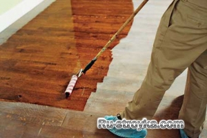 6. При помощи валика с длинной ручкой, наносим первый слой лака, начиная наносить его с дальнего угла, постепенно перемещаясь к двери. Нанеся первый слой, ждем 3 часа до высыхания лака. Далее повторяем операции с лаком, нанося второй слой, сначала пролечиваем кистью около плинтусов, а затем валиком всю комнату.Примерно 24 часа, ждем полное высыхания лака. После чего можно устанавливать мебель на свое место.