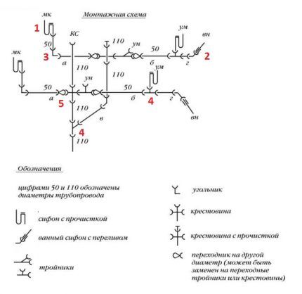 Пример монтажной схемы: мк – мойка; кс – стояк; ун – унитаз (биде); ум – раковина умывальника; вн – ванна, 50 и 110 – диаметры трубопроводов горизонтальных линий и линий стояков; 1 – сифон с прочисткой; 2 – сифон ванны с переливом; 3 – угольник; 4 – тройник; 5 – крестовина; 6 — переходник