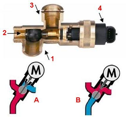 Один из широко распространенных вариантов исполнения трехходового клапана: 1, 2 – угловой проходной транспортный канал; 1, 3 – прямой проходной транспортный канал; 4 – головка привода; A – транспорт потоков в режиме отопления; B – транспорт потоков в режиме ГВС
