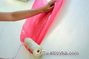 3. Начиная с угла помещения, нанесите первый слой краски на стену, без применения полиэтиленового пакета. Далее поместите пакет уже на нанесенную краску, таким образом, чтобы кайма из краски была видна. Сухой стороной валика вы катаете по пакету, в то время как вторая половина валика с краской, красит стену. Передвиньте пакет на ту половину, где только что вы нанесли еще один слой краски, и проделайте ту же самую операцию, пока не дойдете до другого угла комнаты. |
