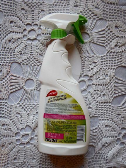 Для обычной чистки спрей разводят водой в определенной пропорции и обрабатывают обивку. Если надо удалить стойкое пятно, на загрязненную область наносят концентрат.