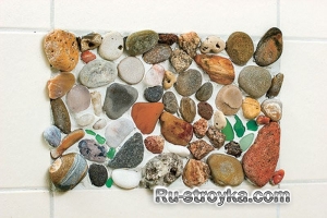 1. Удаляем одну или несколько плиток в шахматном порядке, в ванной комнате или на кухне рабочего стола, и приступаем к декорированию пустого места между керамической плиткой. Приготовив клеевой раствор для укладки камней и ракушек, но в более твердой консистенции, чем для керамической плитки, для лучшего монтажа этих материалов.