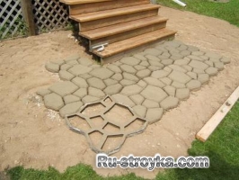 3. Пластиковую форму, уложив на грунт, устанавливая ее вплотную к изготовленному элементу дорожки, после чего продолжаем тот же самый процесс, что и с первым элементом. Швы у дорожки между изготовленных камней затираем цементным раствором, а также помещаем в швы землю, высадив туда траву, тем самым придав дорожке эффект старины.