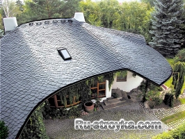 Эта кровля из наиболее дорогих крыш, которые применяются в строительстве, это крыша из натурального сланца, элитного кровельного материала, который был создан природой примерно 400 млн. лет назад. Именно сланцем с 15-го века покрывали крыши европейских замков. Сланец обладает важнейшим преимуществом: сланцевыми чешуйками можно закрыть весь кровельный ковер при любой геометрии кровли. Кроме того, это самый долговечный кровельный материал. Благородный темно-серый, почти черный цвет (наиболее распространенный цвет сланцевой породы), неровная, слоистая структура, характерный «масляный» блеск, все это создает неповторимый стиль «под старину», что привело к настоящему буму сланца в Западной Европе. Для орнаментов используется сланец бордового и зеленого цветов.