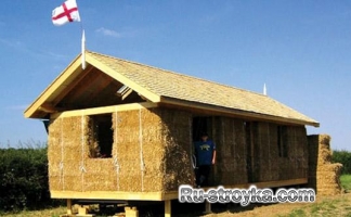 В основе соломенного строительства лежат два основных способа: — использование несущего каркаса из древесины, бетона или металла. В этом случае вначале строятся каркас, затем крыша, после чего строительство из соломенных блоков гарантированно ведется на сухом месте, а сами блоки могут храниться под крышей. В этом случае стены скрепляются с каркасом при помощи болтов либо арматурных штырей. Каркасный вариант требует дополнительных расходов стройматериалов, идущих на устройство каркаса – в этом его главный недостаток. -стены из соломенных блоков делаются несущими, при этом свесы крыши должны быть достаточно широкими. По сравнению с каркасной технологией, бескаркасная обходится гораздо дешевле. Ту или иную технологию строительства выбирают исходя из местных особенностей и качества соломы. ПосколькуСхема бескаркасной стены из соломенных блоков соломенные стены весят немного, то под ними нет необходимости устраивать мощный фундамент. Важно, чтобы расстояние от земли до нижних блоков было не менее 15 см.На сухих грунтах фундамент под одноэтажными домами из соломы имеет следующую конструкцию: в траншею засыпается песок либо мелкий гравий с последующей трамбовкой через каждые 10-15 см. Песок дополнительно поливают водой. Сверху выполняется бетонный или кирпичный цоколь, если нужно – с армированием.На влажных глинистых грунтах лучше устраивать ленточные (бут, кирпич) или столбчатые фундаменты, закладывая их на глубину промерзания грунта. Для теплоизоляции фундамента применяют жесткий пенопласт толщиной 6-12 см, укладывая его вертикально вдоль наружного периметра.Стены из соломенных блоков кладутся по аналогии с кирпичной кладкой. Первый ряд тюков должен быть связан с фундаментом арматурными штырями, заложенными в фундамент на глубину от 18 см. Длина этих штырей должна быть такой, чтобы они могли входить во второй ряд соломенных тюков на половину. Для большей жесткости стеновой конструкции, металлические пруты наращиваются по мере высоты кладки и, в конце концов, пронизывают стену насквозь по вертикали. На верхний ряд тюков накладывается деревянный мауэрлат, а на торчащие прутья с резьбой на конце навинчиваются гайки, при помощи которых осуществляется стяжка стены.Перед укладкой нижнего ряда блоков фундамент гидроизолируют рубероидом или полиэтиленовой пленкой. В регионах с влажным климатом, кладка ведется с помощью цементного или глиняного раствора.На бескаркасных домах крыша должна быть очень легкой. На каркасных – может быть любой. Мауэрлат имеет вид двух параллельных планок, скрепленных поперечными через каждые 60-90 см. Оконные и дверные коробки устанавливаются на деревянных кольях, вбитых в соломенные блоки. В каркасном строительстве оконные и дверные коробки могут быть ненагруженными.Электропроводку закладывают в стену в пластиковом или металлическом трубчатом изоляторе. Прокладка остальных коммуникаций ничем не отличается от традиционной.Снаружи соломенные стены отделываются сайдингом, штукатуркой и прочими фасадными материалами. Перед оштукатуриванием поверхность тщательно выравнивают, заполняя неровности глиняно-соломенной смесью. После этого стены обтягиваются металлической сеткой, которая служит армирующим каркасом для штукатурки.Для защиты соломы от разрушительного влияния микроорганизмо