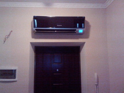 Одним из наиболее распространенных вариантов установки внутреннего блока кондиционера в коридоре считается размещение его над входной дверью. Этот способ позволяет исключить проведение монтажных работ внутри квартиры. Все коммуникации соединяющие блоки и выводящие дренаж находятся снаружи квартиры на лестничной площадке