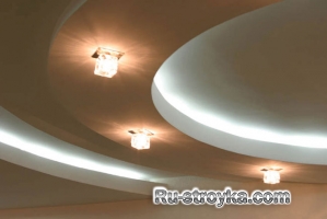 При строительстве или капитальном ремонте есть возможность вывести стены точно по уровню, после чего уложить мощные балки из сухого калиброванного теса. При этом получается плоскость потолка, которую можно обшивать гипсокартонными листами. Полости между балками закрываются мягкой изоляцией из стекловолокна в плитах или рулонах («Isover», «Ursa», «Rockwool» и др.). Этот материал применяется в конструкциях, где изоляция не испытывает нагрузки.Таким образом, в данном случае монтаж гипсокартонных листов ведется без подвесов либо непосредственно по потолочным балкам, либо по металлическим профилям, прикрепленным к ним.Если подшивной потолок устраивается при ремонте помещения в доме старой постройки с деревянными перекрытиями и с высокими потолками, то работы «предстоят значительные. Перво-наперво необходимо проверить штукатурку на предмет прочности сцепления с основанием, и во всех сомнительных местах оббить ее до дранки. Дело в том, что если со временем штукатурка на потолке отстанет и кусок ее упадет на гипсокартонные листы, на поверхности фальшпотолка появятся трещины. Поэтому, если есть сомнения, лучше убрать больше штукатурки, чем оставить нетронутыми подозрительные места.При необходимости, как было сказано выше, к потолку крепится мягкая изоляция из стекловолокна или минваты, которая поможет сохранять тепло в холодное время года. Последнее особенно актуально в загородном доме, где, как известно, основная часть тепла из отапливаемого помещения уходит через щели в потолке.Имейте в виду, что материалы отечественного производства из обычной минеральной ваты запрещены к использованию в жилых помещениях. Как вариант, ее можно укладывать в потолок, предварительно запаяв утюгом в полиэтилен.Далее на стенах по гидроуровню размечается линия фальшпотолка, и по выполненной разметке анкерными гвоздями закрепляются деревянные брусья сечением не менее 30×50 мм (без учета теплоизоляции). Соединение должно быть жестким и надежным, с шагом крепежа не более 500 мм.После установки брусьев по периметру помещения, к ним крепятся несущие брусья сечением 30×75 мм с шагом 1200 мм. Между ними крепятся дополнительные брусья сечением 30×50 мм: для гипсокартонных листов толщиной 12,5 мм — с шагом 600 мм, для гипсокартонных листов толщиной 9,5 мм — с шагом 400 мм.В углах рамка из брусьев дополнительно укрепляется для избежания деформации.Если длины листа не хватает, чтобы перекрыть всю комнату, листы при облицовке располагают со смещением смежных торцевых стыков (в разбежку), а в местах соединений монтируют поперечные брусья сечением 30×75 мм.Готовую обрешетку обшивают гипсокартонными листами, используя шурупы для дерева длиной 35 мм с шагом 200 мм. Работа ведется от угла в двух взаимно-перпендикулярных направлениях или от середины к краям. Между листами гипсокартона должно оставаться пространство в 5 — 7 мм для отделки швов.Можно ли делать фальшпотолок на деревянном каркасе в нескольких уровнях, с использованием криволинейных поверхностей, карманов, выступов и т.п.? Можно, но при этом жесткость конструкции должна быть максимальной, чтобы избежать со временем появления трещин и искривления каркаса.При устройстве в подшивных фальшпотолках на деревянном каркасе местного освещения, встроенных светильников, ламп и пр. особое внимание необходимо уделить правилам 